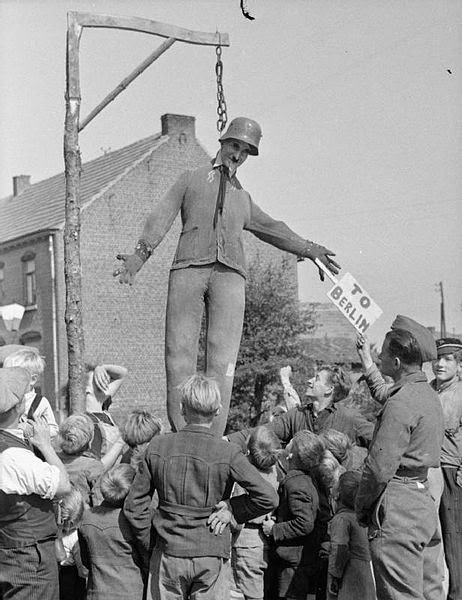 Liberated Belgian villagers hang an effigy of Hitler, 12 September 1944.